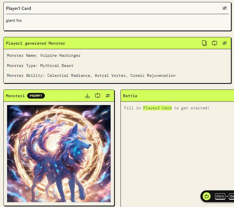 2人のプレイヤーがモンスターカードとサポートカードを用いてカードバトルを行います。プレイヤーはカードにして欲しいモンスターの情報を画面上部の白枠に入力するだけで、自動でモンスターカードとサポートカードを1枚ずつ生成し、バトルを開始します。