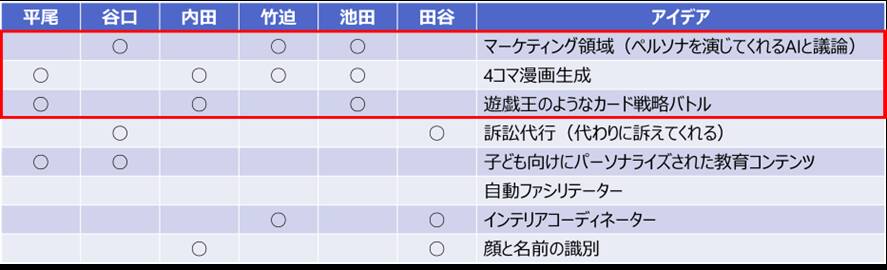 「4コマ漫画生成」や「マーケティング領域(ペルソナを演じてくれるAIと議論)」も開発していて非常に面白いものでしたが、「独自性」や「精度」の観点から開発の優先度を落とすことにしました。今回のハッカソンでは深堀をすることはありませんでしたが、また機会があれば、再度開発に挑戦してみたいと思えるようなアイデアでした!
