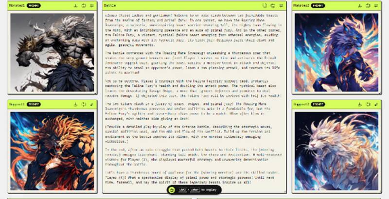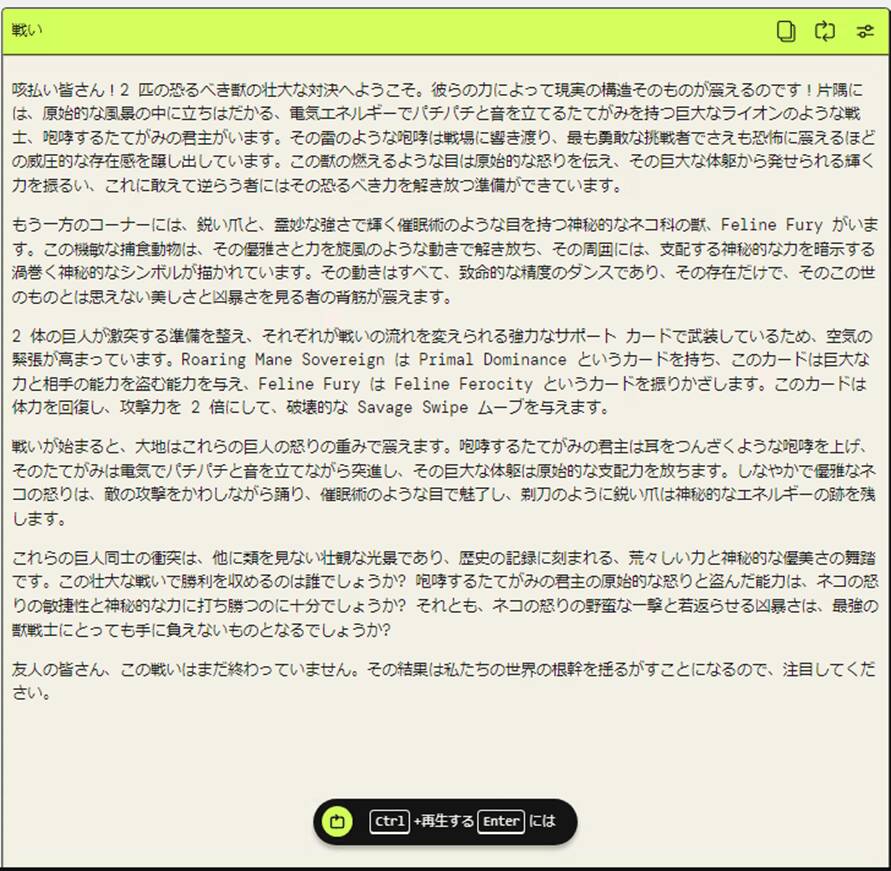 最後に生成されたカードを用いて、あらかじめ定めていたルール通りにバトルを行わせ、生成AIには実況者になったつもりでカードバトルの実況を行わせました。