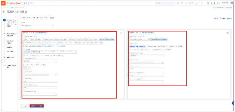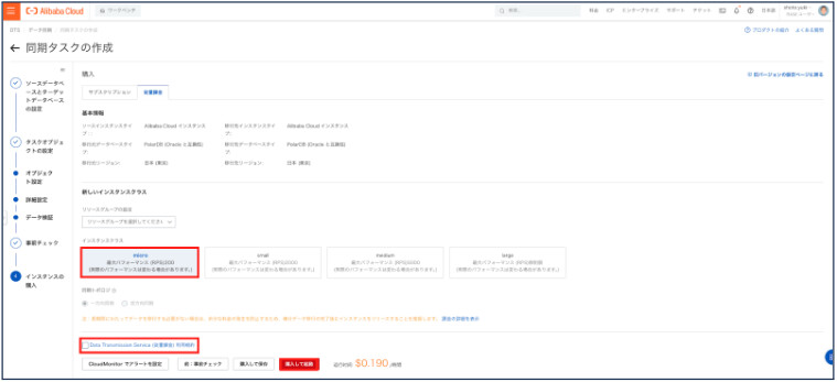 13 ) 入力内容を確認し、インスタンスクラスを選択します。今回は同期するデータ量が少ないため「micro」を選択しますが、データ量に応じてインスタンスクラスを選択します。その後、DTSタスクを購入します。今回は、DTSタスクの購入後、すぐにデータ同期を行う「購入して起動」を選択します。DTSタスク購入後、すぐにDTSタスクの実行をしたくない場合は、「購入して保存」をクリックします。