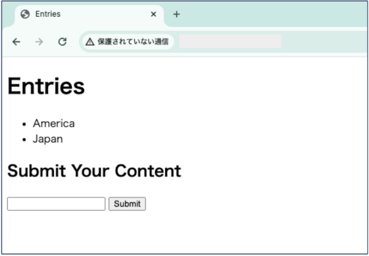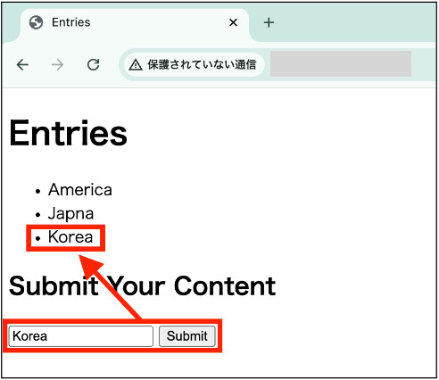 2 ) Submit Your Contentで「Korea」と入力してSubmitをクリックし、Entriesに表示されるか確認をします。実行するとEntriesにSublitしたKoreaが表示され期待する動作をしました。