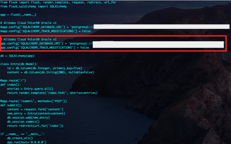 3 ) アプリケーションが動作している環境にログインし、v1クラスタのエンドポイントをv2クラスタのエンドポイント(<Alibaba Cloudコンソールでの操作> 17 )でコピーした内容)に変更します。