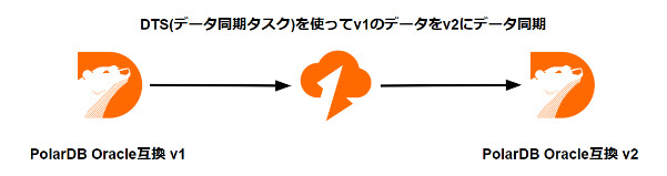 今回紹介するPolarDB for PostgreSQL(Oracle互換)のv1からv2に移行する方法は、移行先のv2クラスタを事前に用意し、DTS(データ同期タスク)を使ってv1クラスタのデータをv2クラスタにデータ同期をする移行方法です。この方法はAlibaba Cloudが公開しているv1クラスタからv2クラスタへ移行する方法のベストプラクティスとなります。