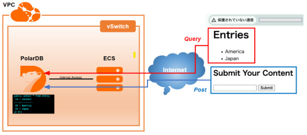 ECS(CentOS7)上でFlask + Gunicornを使ったWebアプリケーションです。このアプリケーションはWebブラウザ上で動作しており、PolarDB for PostgreSQL(Oracle互換)の特定のテーブルに対してQueryやデータのPostをすることができます。なお、ECSはPolarDB for PostgreSQL(Oracle互換)のInternalエンドポイントを指定して通信を行っています。
