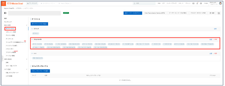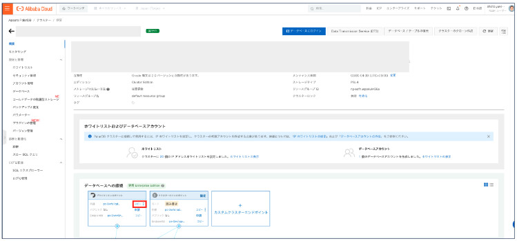 16 ) PolarDBコンソールに戻り、4 ) で作成したv2クラスタのインスタンスIDをクリックし、「ホワイトリスト」をクリックします。必要に応じて「IPホワイトリストの追加」を行います。
