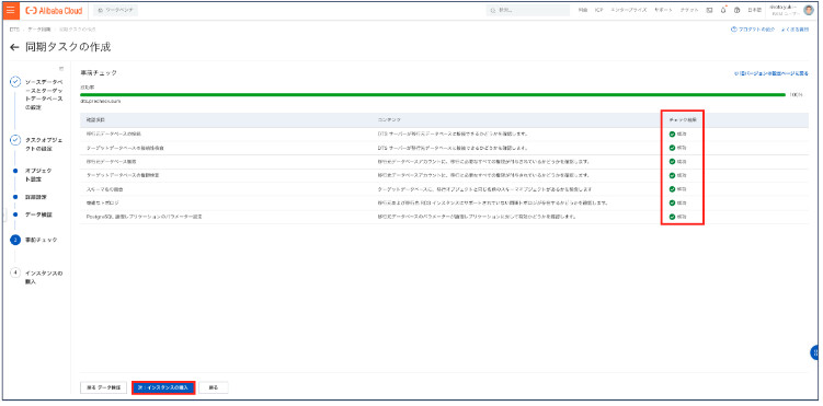 12 ) 同期タスクの事前チェックが行われます。事前チェックが全て成功したら「インスタンスの購入」をクリックします。