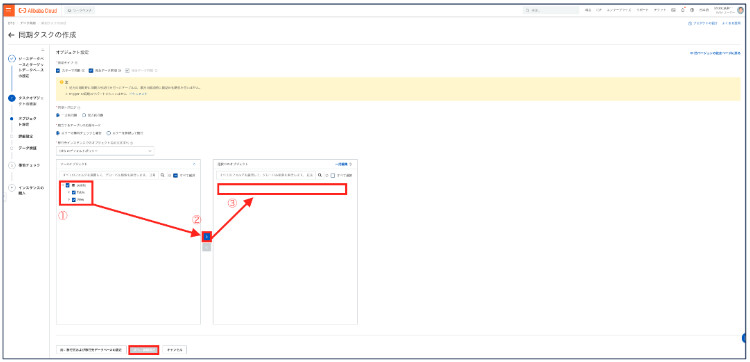 9 ) ①同期するデータのチェックボックスにチェックを入れ、②で矢印ボタンをクリックし、③で移行したいデータが「選択中のオブジェクト」の欄に表示されていることを確認します。同期したいデータの選択が完了したら「次へ:詳細設定」をクリックします。