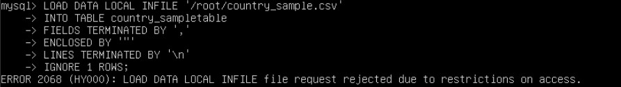 mysql>LOAD DATA LOCAL INFILE ‘/root/country_sample.csv’