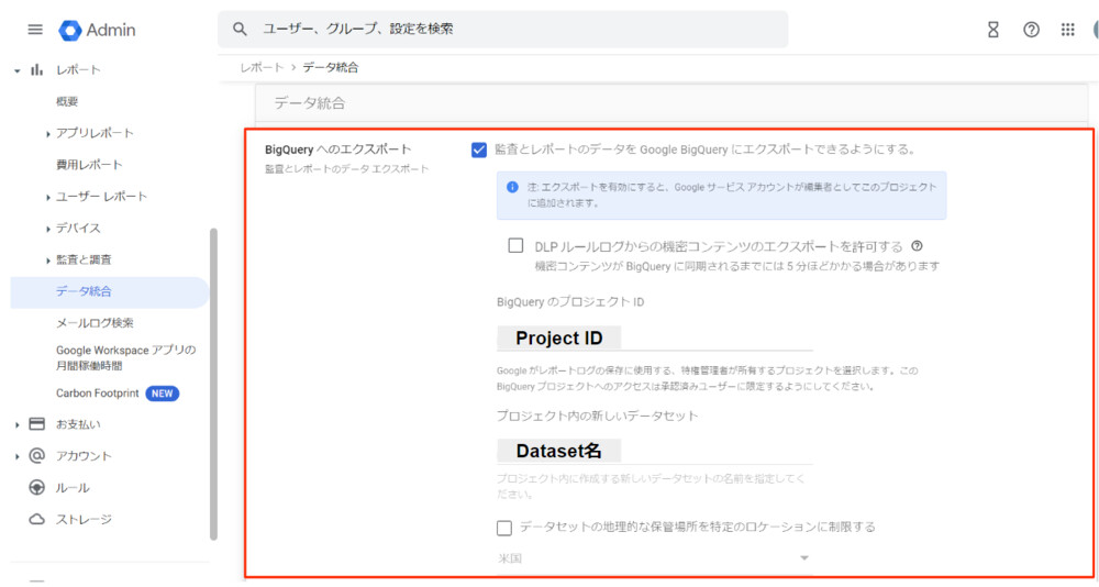 GWSでは管理コンソールから [レポート] > [データ統合] > [BigQuery へのエクスポート] にアクセスし、エクスポートの有効化とエクスポート先の設定を行います。