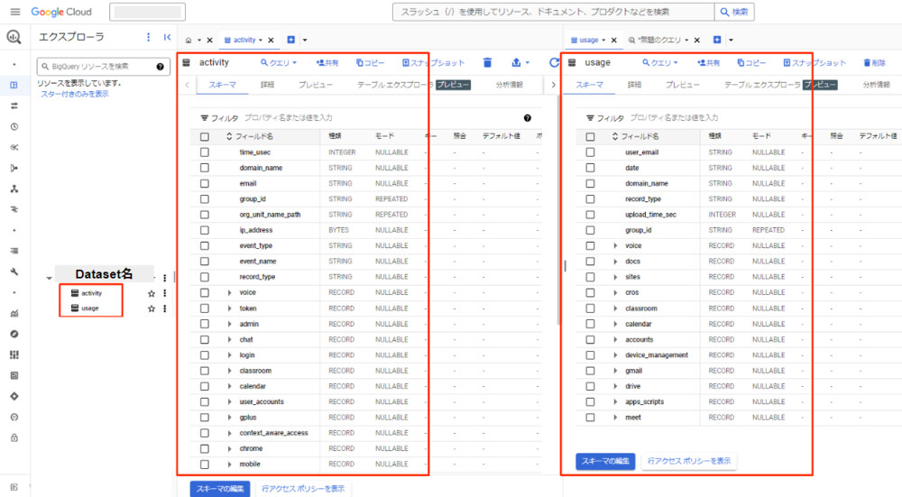 設定後、指定したデータセットに自動的にテーブルが作成されデータがエクスポートされます。