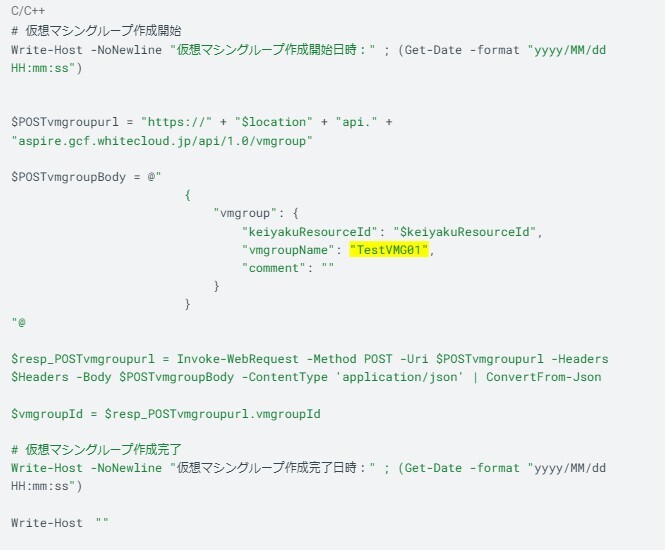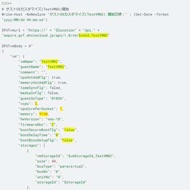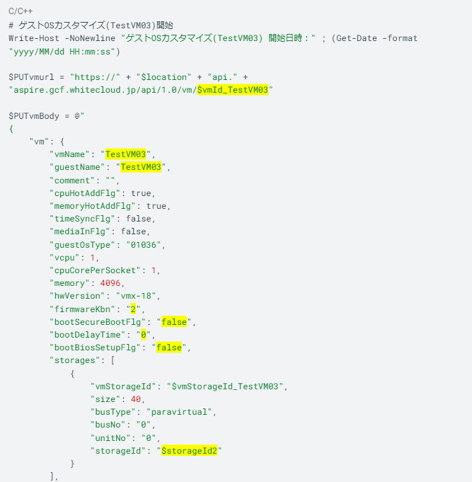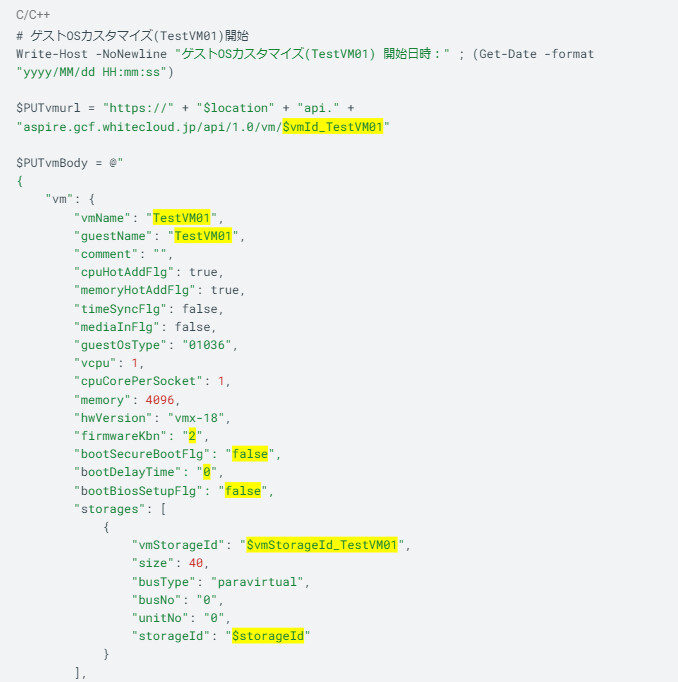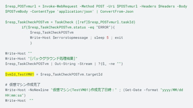 仮想マシン作成後に、作成した仮想マシンを編集するための仮想マシンIDを取得し、$vmId_TestVM01として定義します。
