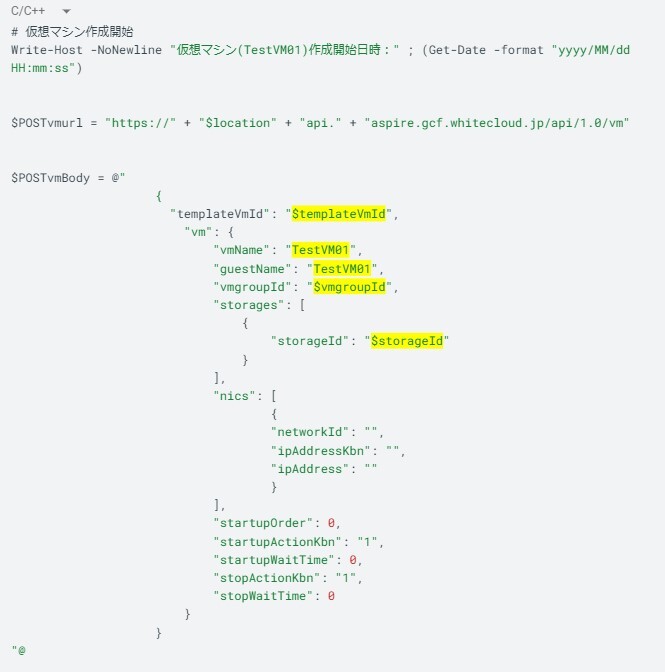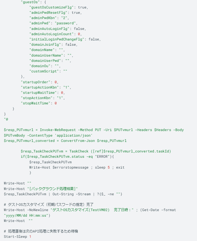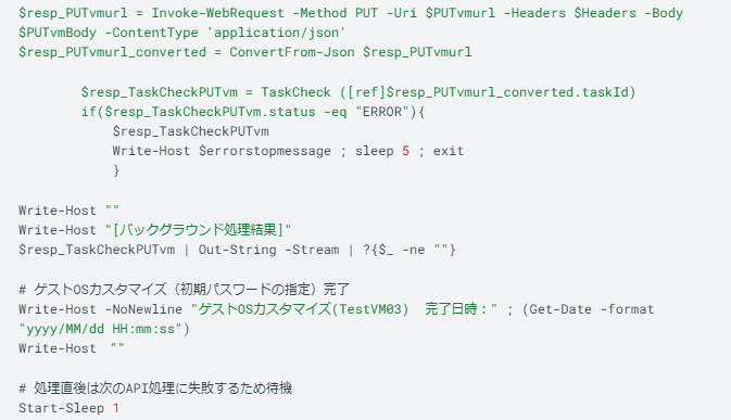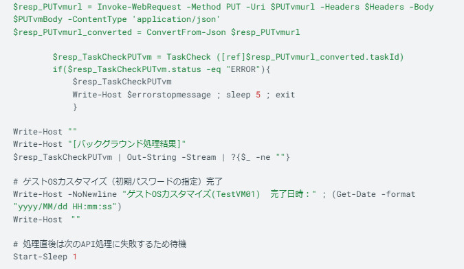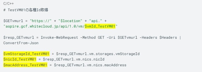 また、この後仮想マシンの編集を行いたいため、252行目〜260行目で作成した”TestVM01”の仮想マシンID($vmId_TestVM01)を使用して各種IDを取得しています。