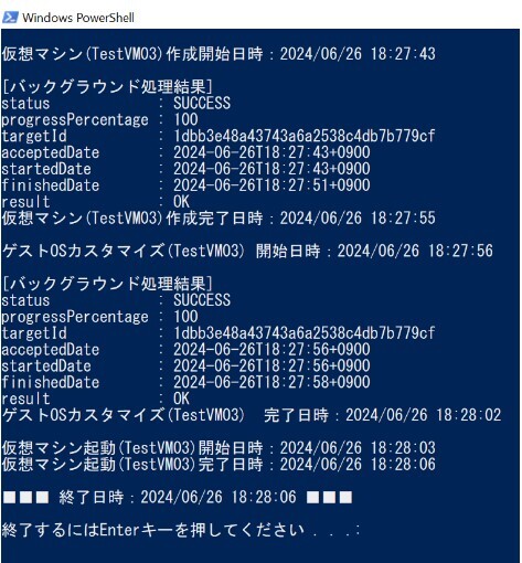 対象仮想マシンの指定はTestVM01同様に仮想マシン作成時に$vmId_TestVM03を定義することで指定します。