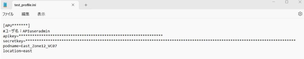 今回はファイル名:test_profile.iniで作成をしました。今回の対象リソースはVC07_Committed_01で実施したいため、