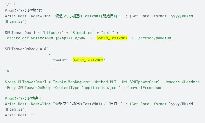 対象仮想マシンの指定はポイント⑦で定義した”TestVM01”の仮想マシンID($vmId_TestVM01)を使用します。