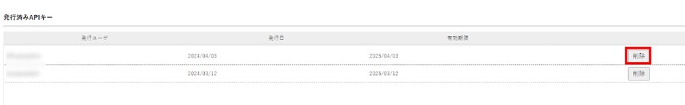 ※APIキーを削除する場合は対象APIユーザの右にある赤枠の削除をクリック