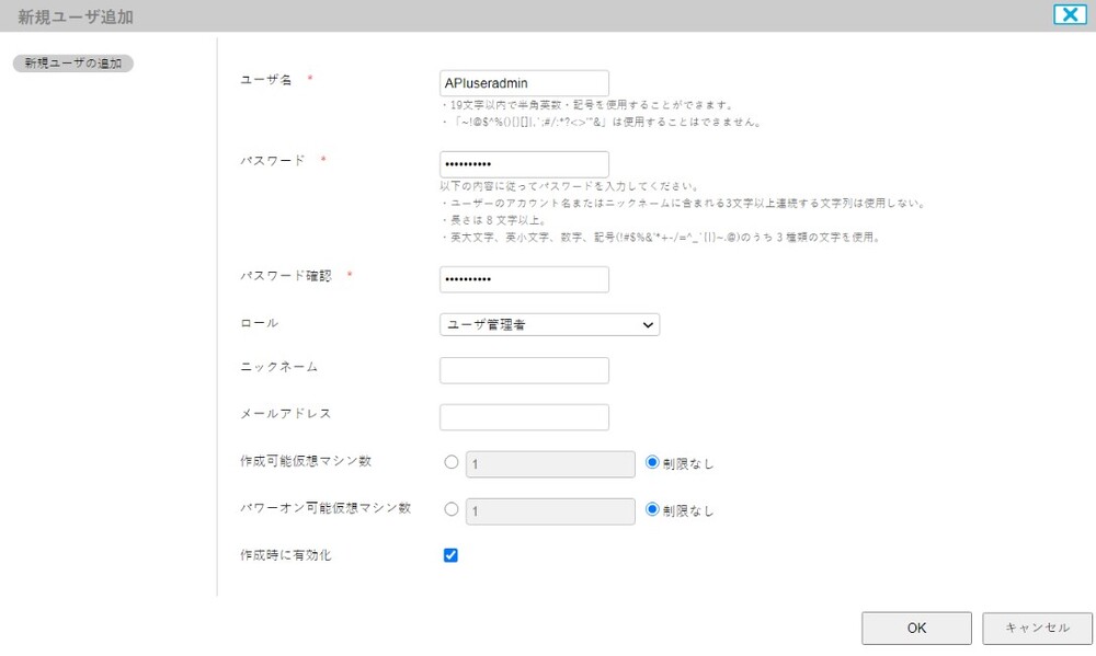 [ユーザ]で[+]をクリックし、[新規ユーザの追加]を実施してください。今回は例として、APIuseradminでユーザ管理者を作成しました。