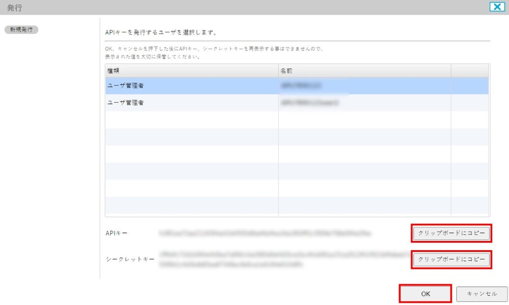 APIで使用するユーザアカウントの右で[発行]をクリックするとAPIキーとシークレットキーが発行されます。