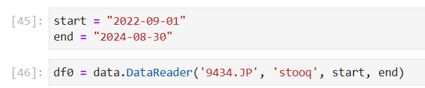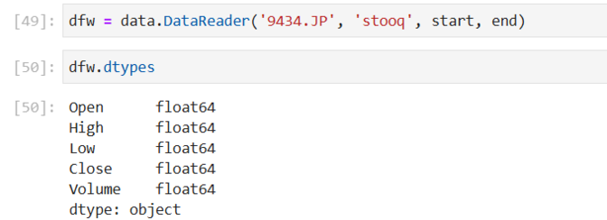 次に DataFrame 型で株価と日時のデータを取得してみようと思います。コードは以下の通りです。9434.JP はソフトバンク株式会社の証券番号で、データを取得してくるサイトは「stooq」を指定します。(※こちらが stooq のサイトです。)ここの値は個人の好きなように編集することができるので、他の企業の株価や他のサイトからデータを取得してみたい方がいましたら変えてみるといいと思います。