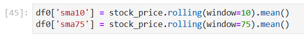 細かい説明は後にして、実際にこの線を先ほどの株価のグラフに追加してみようと思います。まずは以下のコードを入力して、単純移動平均線の値をデータに追加します。期間は10日間と75日間を設定します。なお、1つ1つ平均値を計算で出していくのは途方もなく時間がかかるので、pandas の rolling 関数を用いると、DataFrame に対してデータ区間を移動させながら関数を扱うことができるので今回はそちらを使用したいと思います。そしてその関数で定義した値を DataFrame に新しく追加していきます。