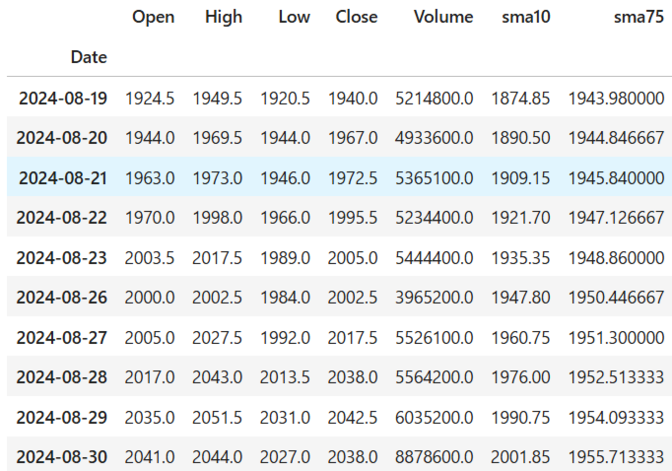以上の表のように、例えば単純移動平均の期間の設定を5日間にすると、「2024-08-30」の単純移動平均の値は、2024-08-26~2024-08-30までの株価の終値の平均値となります。これらの値をそれぞれの日にちで算出して線で結ぶと単純移動平均線となります。