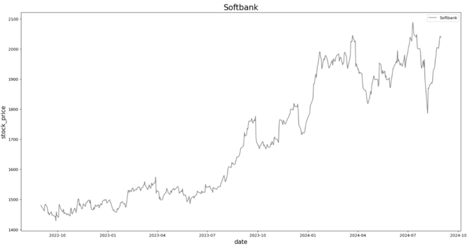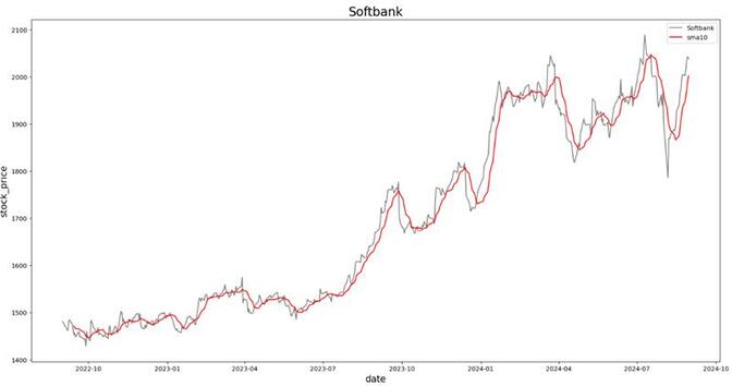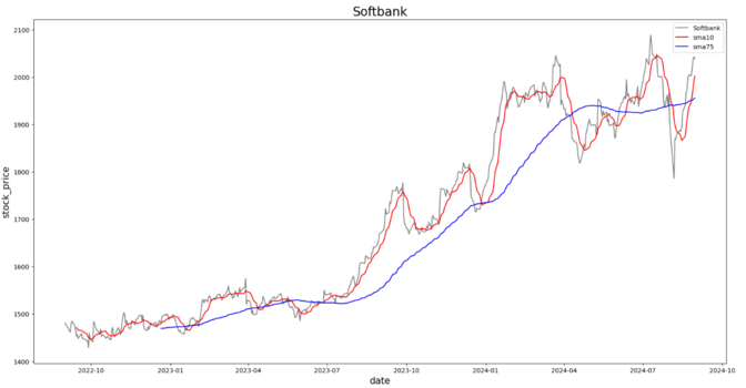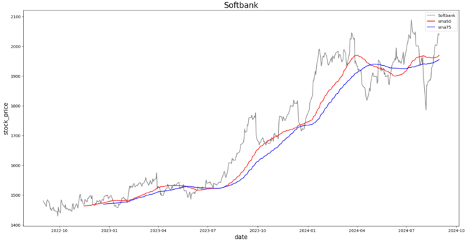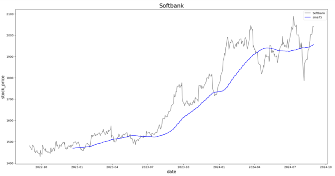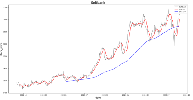 単純移動平均線(Simple Moving Average)とは、ある一定の期間の株価の平均を線でつなぎ合わせたもののことを言います。例えば、今回分析対象にしているソフトバンク株式会社の株価を例にしてみましょう。