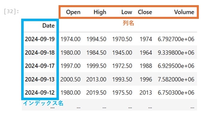 さきほど、dtypesのコードでそれぞれの列のデータ型を確認したところですが、そういえば一番左の列の「Date」の型が出ていませんでした。「あれ?列として認識されていないのか?」と思ったので調べてみることにしました。調べてみた結果、そもそも Pandas のDataFrame型は以下の図のように列と行からできており、「Date」の部分は列ではなく、行の名前にあたる「インデックス」と呼ばれる部分になります。それぞれの行の番号にあたる部分のようですが、今回のデータの場合には日付がこのインデックスになっているようです。