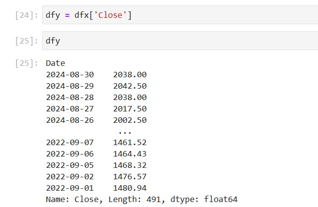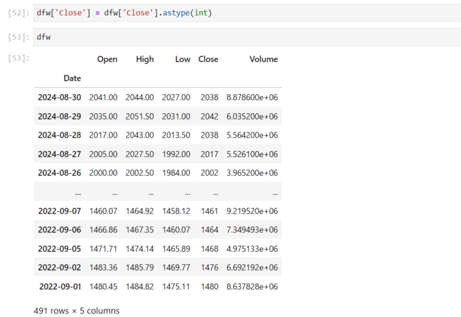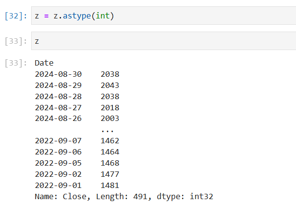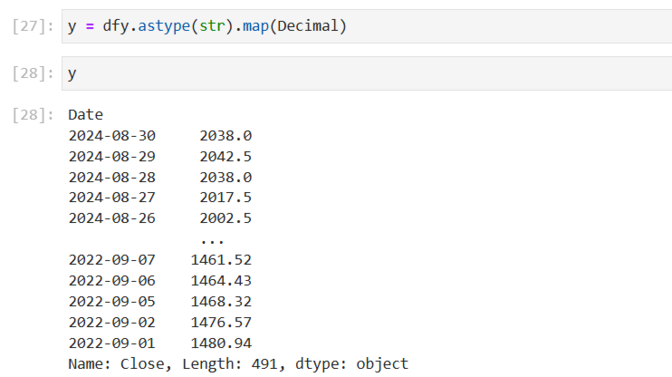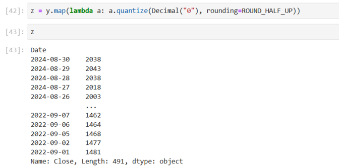 続いて、データフレームから終値(Close) の列を個別に抜き出します。あとでまた四捨五入した値を新しい列として加えて、比較するために今回は個別に抜き出します。