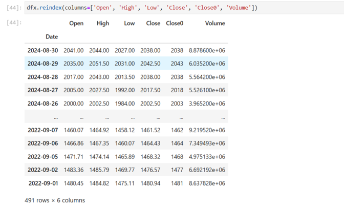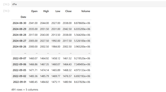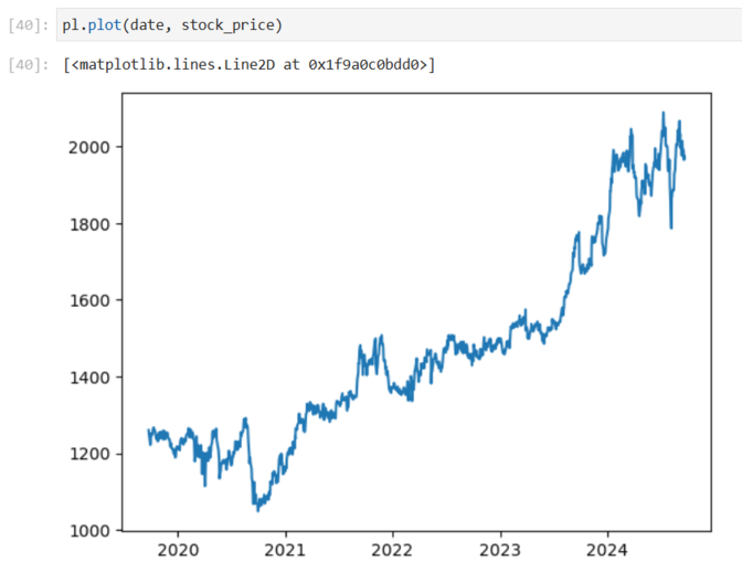 ようやく可視化することができました!!データを可視化するまでの道のりを超えてようやく株価の変動のグラフを作成することができました。このグラフを見る限り異常値と見受けられる値(株価)はないので、今回の分析においては、異常値の処理は行わないということにします。グラフとして不足している部分や自分なりに編集したい部分があるので少し編集してみようと思います。まず、期間を2022年9月1日から2024年の8月31日までにしたいと思います。新しく変数も df0 と定義します。