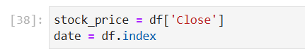 ということで必要なデータが揃いました。日時にはインデックス(Date)を用いて、株価には終値(Close) を用いて可視化を行いましょう。まずは変数を扱いやすいように定義します。