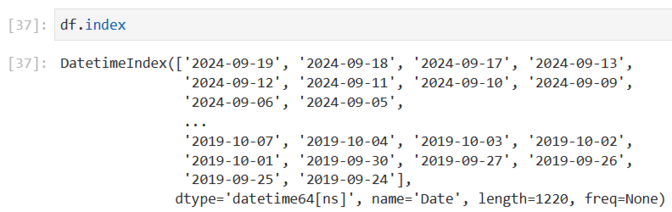 出力の先頭に「DatetimeIndex」と表示されています。これは時系列データ処理や、日時データをインデックスとして使用する際に適したインデックスです。よって、このインデックスのデータを日時のデータとしてそのまま使いたいと思います。