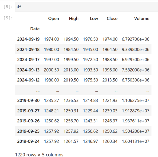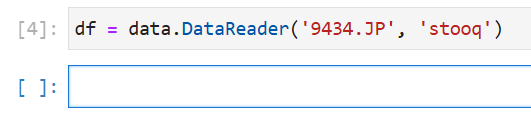 さて、データを取得できましたが、上の画面のように何も出てきません。「え?なんで?」と思いましたが、この取得したデータを見るためには、自分で定義した変数名の「df」を入力しなくては出てこないらしいので確認してみましょう。