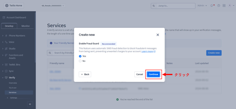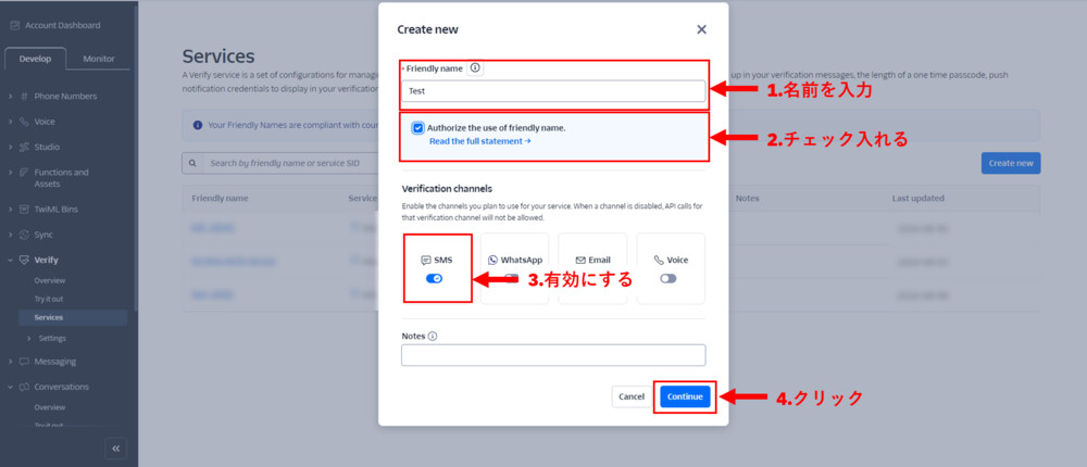 3.「Friendly name」に適当な名前を付けて「Authorize the use of friendly name.」にチェックマークをつけます。「Verification channels」からSMSを有効にして「continue」ボタンをクリックします。
