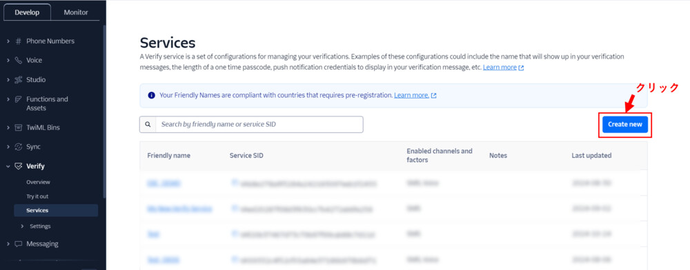 2.Verifyにアクセスし、「Services」から「Create new」ボタンをクリックします。