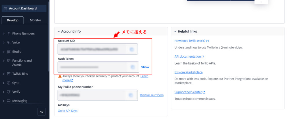 アカウントSIDとAuthTokenを利用するので、メモに控えておいてください。Account Dashboard内から確認できます。