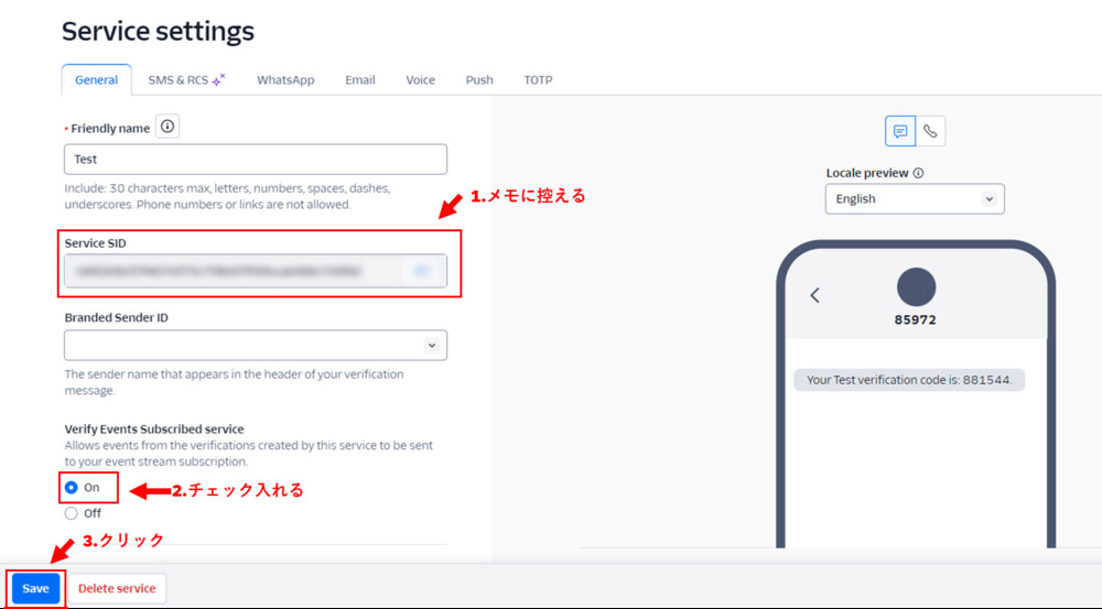 5.「Verify Events Subscribed service」をオンにし、「Save」ボタンをクリックします。