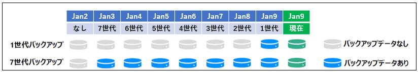 7世代バックアップの場合は7日経過後、バックアップデータが削除されます。