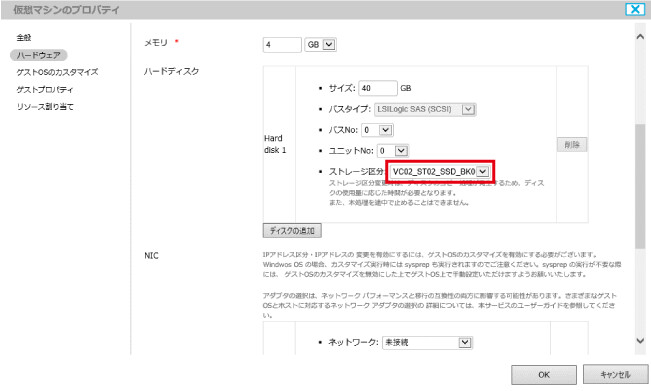 セルフポータルサイトから「仮想マシン」タブをクリックします。変更する仮想マシンを右クリックし、「プロパティ」をクリックします。左ペインで「ハードウェア」をクリックします。ディスク単位で、ハードディスクのストレージ区分を変更することで、日次バックアップの取得有無およびバックアップ世代数を変更できます。(仮想マシンを停止せず通信影響なく実施できます!)