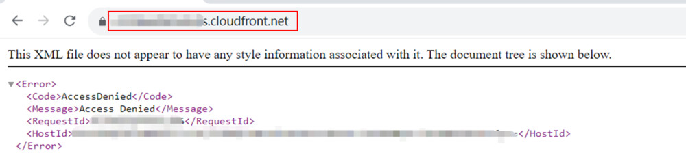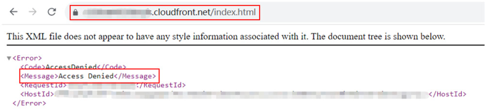 CloudFrontインスタンスが正常に作成された後、コンソールに表示されたアクセスアドレスにブラウザから直接アクセスすると、「Access Denied(権限がない)」というエラーメッセージが表示されます。これはコンソールに表示されているアクセスアドレスが、S3 bucket のルートディレクトリに合わせていないためです。このエラーを排除すべく、特定のページに正しくアクセスできるようにするには、この作業の後にファイルパスを追加する必要があります。例えば、プロジェクトのホームページ、つまりルートディレクトリにある `index.html` ファイルにアクセスする場合、アクセスアドレスの後に対応するファイルパス情報(`/index.html`)を追加することで、エラーは解消します。