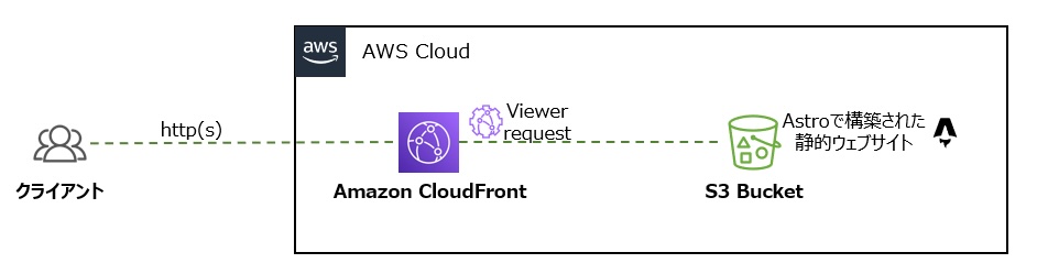 構築の流れとして、Astroでbuildし生成した静的WebサイトをS3 Bucketへデプロイします。あとはAmazon CloudFrontサービスを使用して、パフォーマンスとセキュリティを確保しながら静的コンテンツの配信を高速化します。なおAstro 3.xにはNodejsのバージョンが必要なので、v18.14.1以上を使用する必要があります。