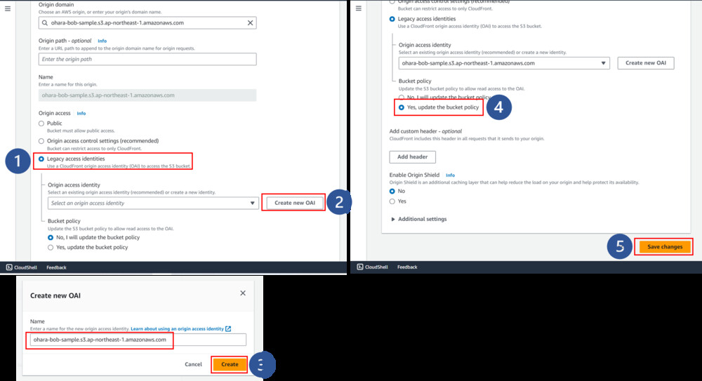CloudFrontとS3 bucket の関連付け権限を設定する方法はいくつかあります。以降のステップでは、AWSが推奨するCloudFront OAC(Origin Access Control)の設定方法を使用します。