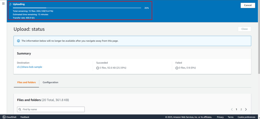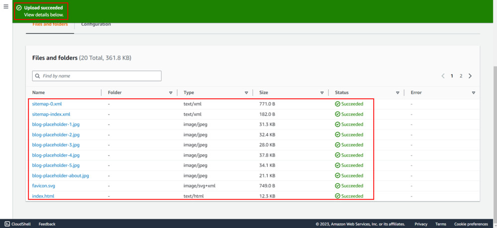 アップロードに成功すると、生成されたすべてのファイルがローカルの `dist` ディレクトリから S3 ストレージ bucket のルートにアップロードされます。