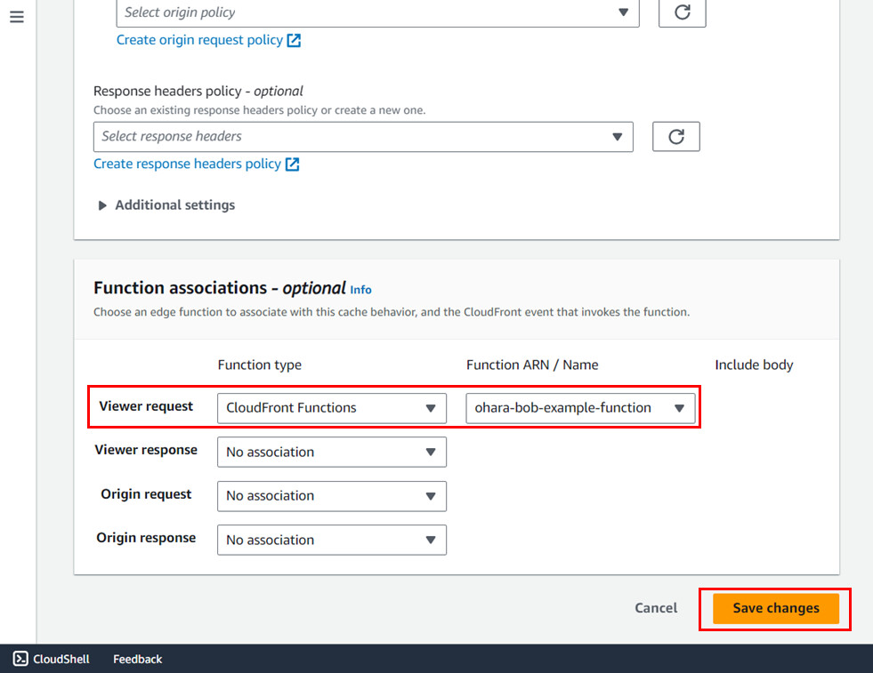 CloudFrontインスタンスの`Behavior`タブで、新しく公開した関数を`Viewer Request`に関連付けます。ドロップダウンリストを使用して、対応する設定オプションを選択することができます。