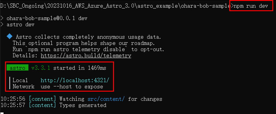 生成されたプロジェクトのルートディレクトリに入ったら、`npm run dev`コマンドを使ってアプリケーションを開発モードで起動します。ローカルからブラウザでプロジェクトページを見るには、http://localhost:4321/ にアクセスします。