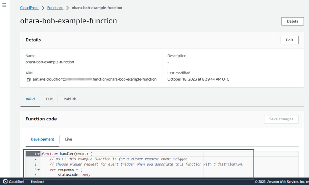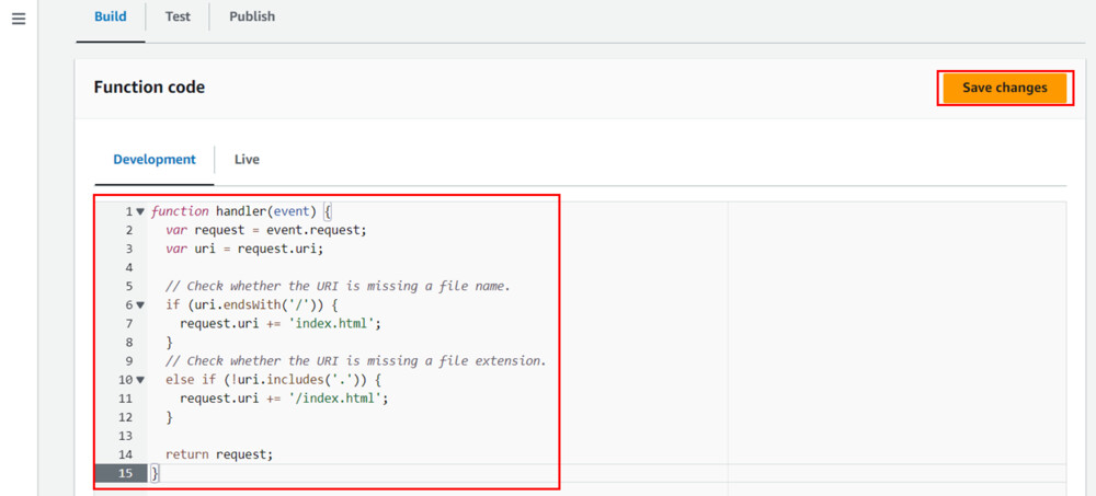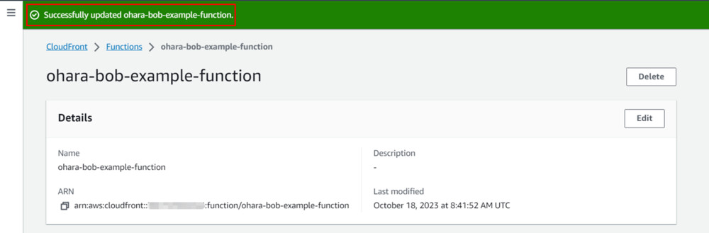 CloudFrontの関数コードを更新して、ページリクエストのリダイレクトを完了させます。