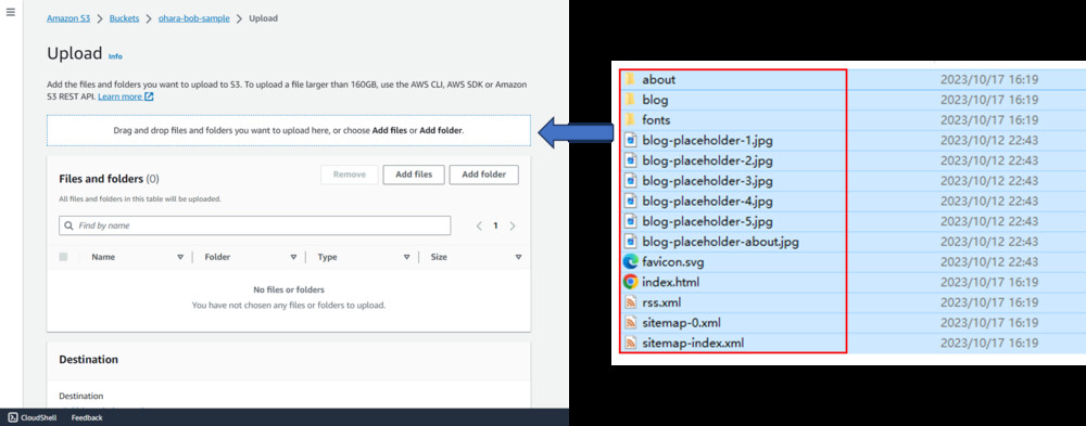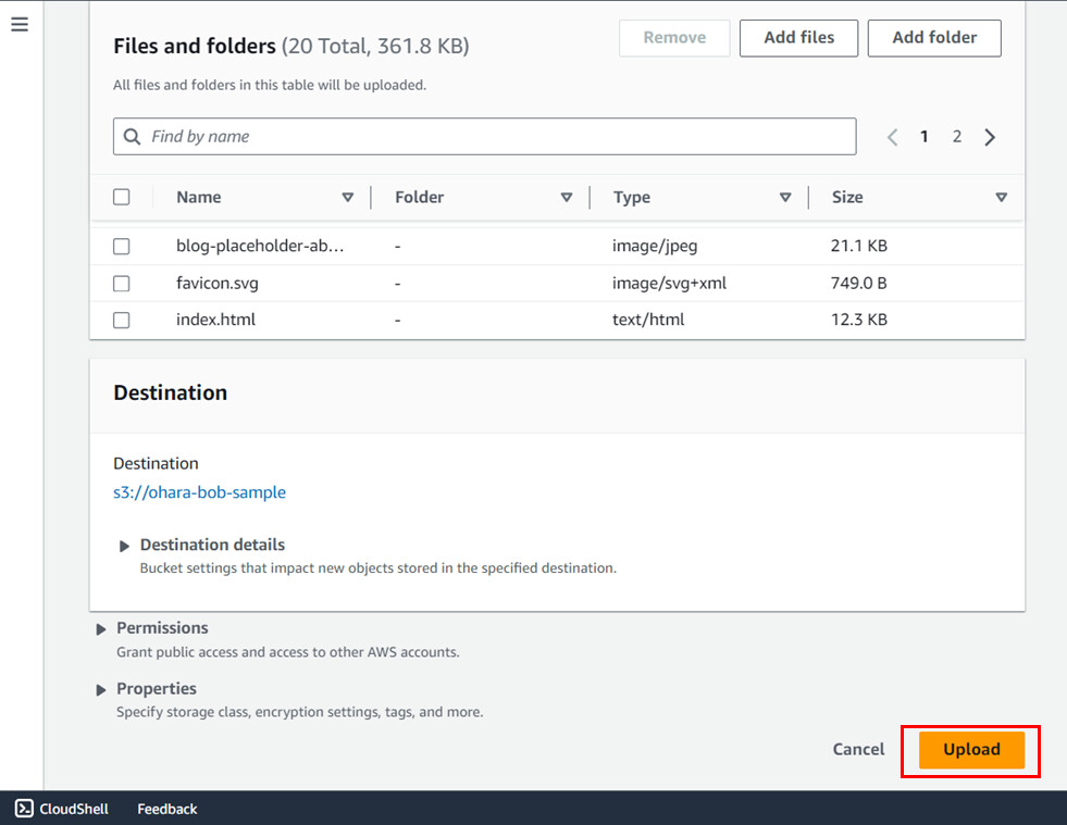 bucket が正常に作成されたら、CLIコマンドまたはコンソールからアプリケーションプロジェクトの build 出力を bucket へアップロードします。