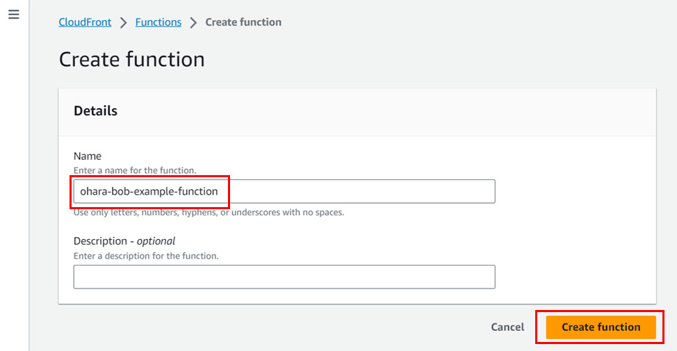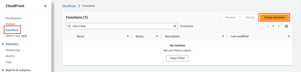 この問題を解決するには、リクエストのリダイレクトのためのCloudFront関数を設定する必要があります。CloudFront 関数管理ページで新しい関数を作成します。
