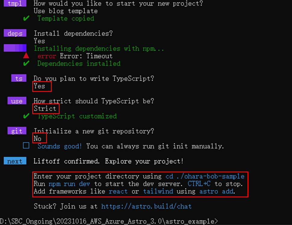 Astroインストールウィザードを使用してAstroプロジェクトをインストールおよび設定する際、インストール依存パッケージのステップでタイムアウトエラーが発生した場合、その後のステップでnpm runコマンドを使用すると、高い確率で「astro not recognized」エラーメッセージが表示されます。
