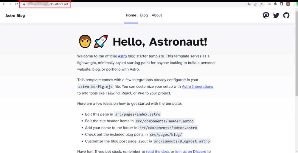 この時点で、AstroプロジェクトはCloudFrontのアクセスアドレスから普通にアクセスできます。 ページ内容はローカル起動した時と同じです。