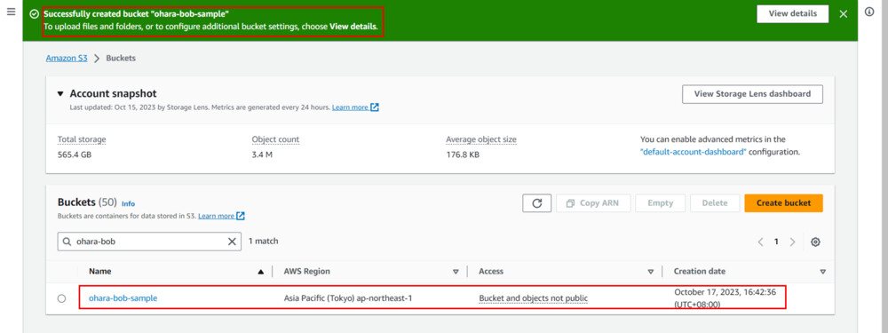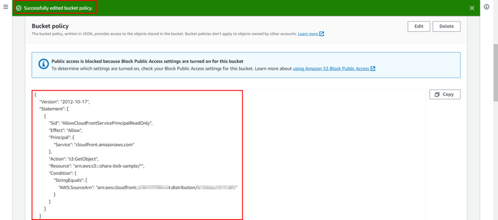 保存に成功すると、S3 bucket 許可ポリシーセクションに新しく設定された許可ポリシーが表示されます。